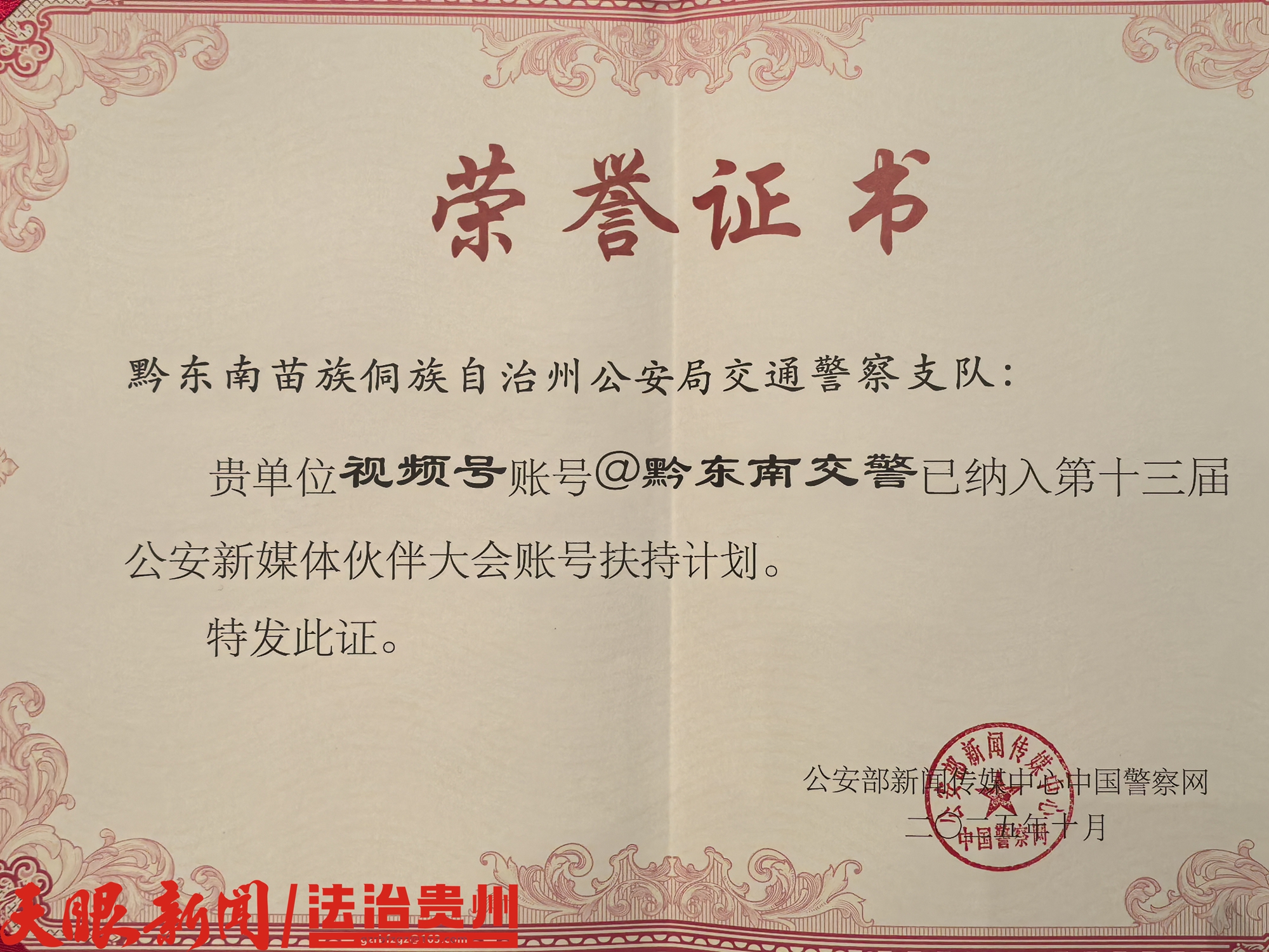 10月11日,第十三屆公安新媒體伙伴大會在陜西西安成功舉辦。會上正式啟動了公安新媒體賬號扶持計劃,并公布第十三屆公安新媒體伙伴大會扶持賬號名單,黔東南州公安局交警支隊官方視頻號“黔東南交警”成功入選。